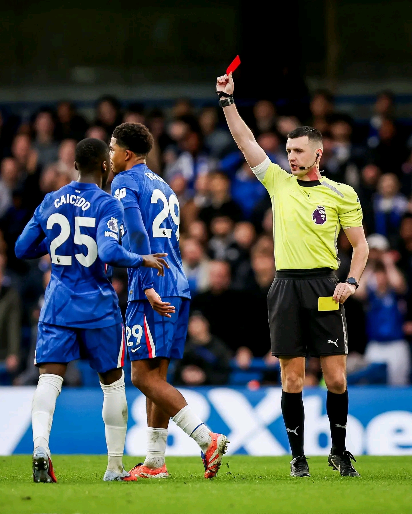 Then Marc Cucurella at Fulham in January, a red card that arrived in the 22nd minute and forced Chelsea to play more than an hour with ten men at Craven Cottage. Moises Caicedo rounded off the set against Arsenal at the end of November, his studs planted into the ankle of Mikel Merino in a challenge that looked bad in real time and even worse on the pitchside monitor. And now Fofana.